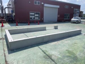 アンカーボルトが等間隔に配置された強固なコンクリート基礎。